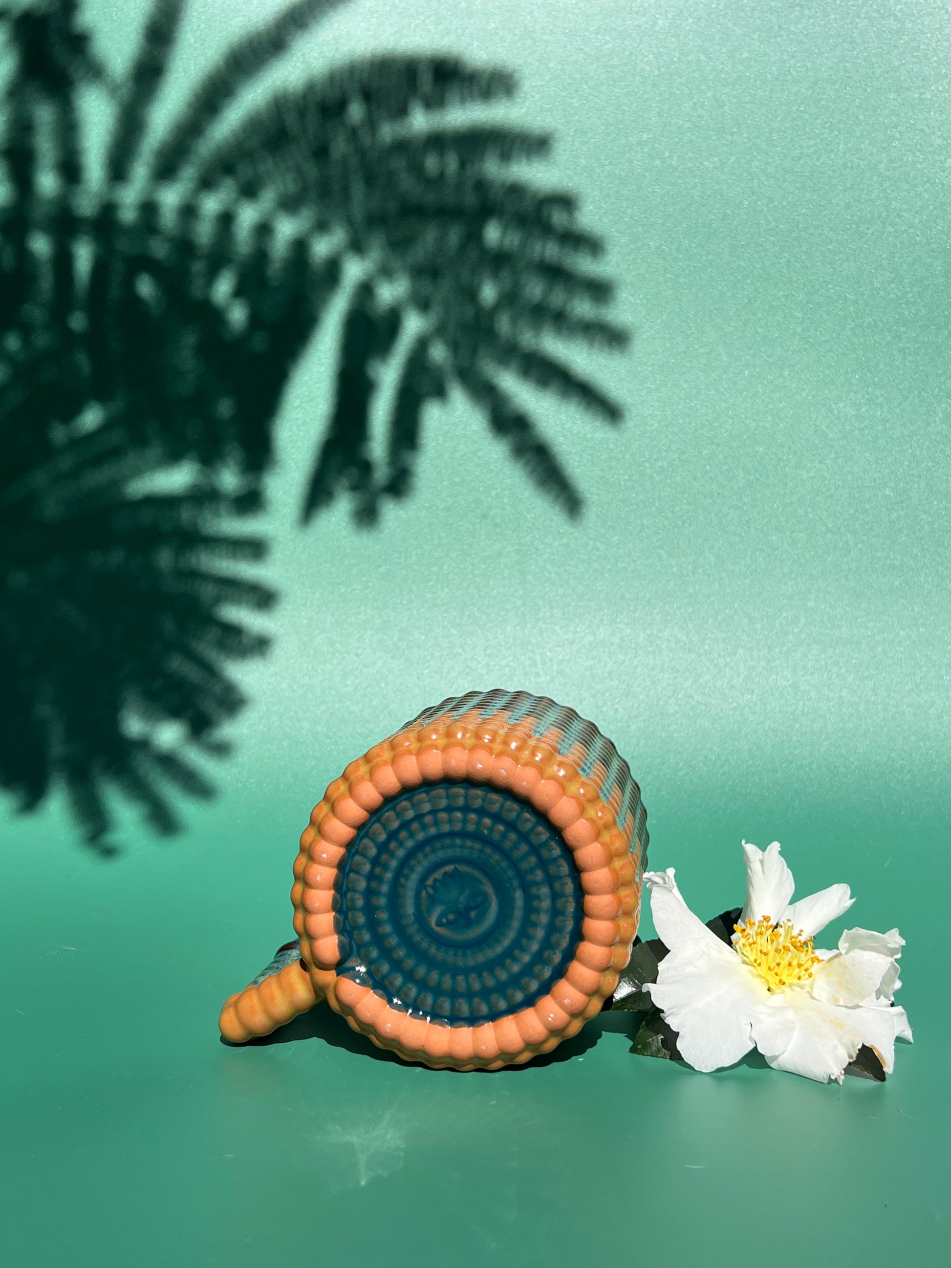 This Gozarian Mug has a little dimple texture, is cast in white clay with an terracotta finish and glazed in an iron drip glaze along with aqua yellow and deep blue glazes. This mug is a multiple, so your mug may have slight variations 💓