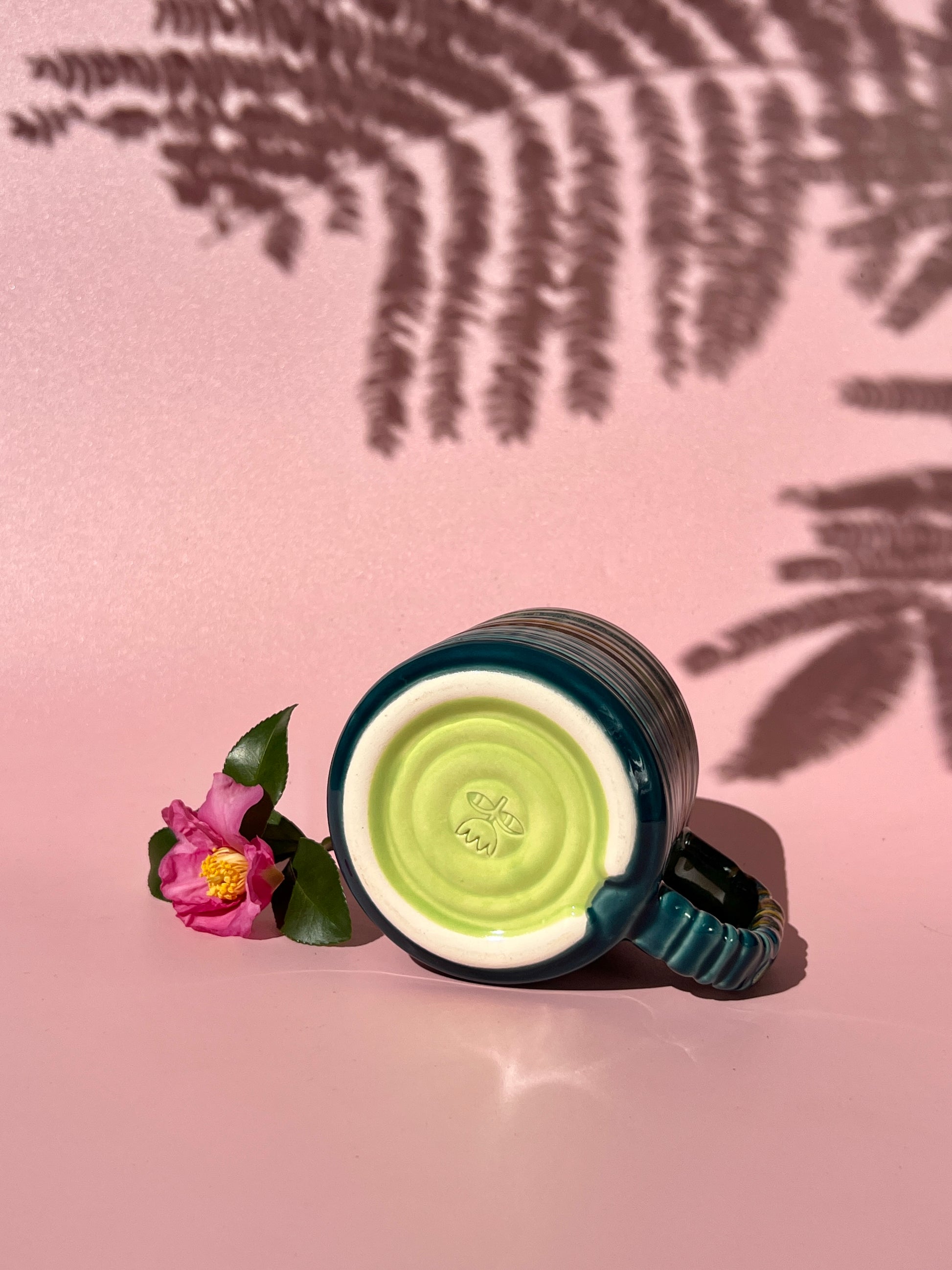 This Rizzo Mug has a varying horizontal texture, is cast in white clay and glazed in an iron and deep aqua glaze. This mug is a multiple so your mug might have slight variations 💓
